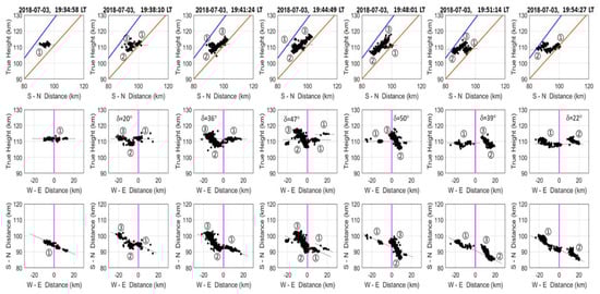 Figure 8 shows the sequential evolution of three-dimensional spatial structures of the Es layer perturbed by gravity waves in increments of about 3.5 min, in which δ is the tilt angle of the wave-deformed Es layer or plume-like plasma irregularities with respect to westward or eastward directions. Dashed lines in the zonal and horizontal planes represent projections of a horizontally stratified thin Es layer intercepted by the expected echoing region on respective planes. Therefore, the Es FAI echoes distributed along the dashed lines can be regarded as the echoes from the 3 m FAIs embedded in the horizontal thin Es layer, and those with other patterns should be caused by either deformed layers or large-scale plasma irregularities in various shapes, such as isotropic or anisotropic structures. The FAI echo regions marked with ①, ②, and ③ denote the echoes associated with the horizontal thin Es layer and the anisotropic plasma irregularities, respectively. Symbol ① signifies the background Es layer formed by the semi-diurnal tide, and ② and ③ represent plume-like or clump-type FAIs with negative and positive Doppler velocities, respectively. From their Doppler velocity distributions at time 19:38:10 LT shown in Figure 4, the FAIs marked with ② showed a downward and southeastward drift with negative Doppler velocity of about −20 m/s, while those marked with ① and ③ were moving southeastward, associated with negative and positive Doppler velocities of −55 and 10 m/s, respectively. However, just 3 min later, at 19:41:24 LT, the Doppler velocity of ③ increased dramatically from 10 m/s to 50 m/s or more and extended upward from 113 km to 117 km. At this time, irrespective of their opposite Doppler velocities, the irregularities ② and ③ merged together to form a long and slanted anisotropic irregularity with dimensions of about 12 km in zonal, 8 km in meridional, and 10 km in vertical directions, which was inclined toward the east at an angle of about 36° relative to the westward direction. In Figure 8, it is clear to see that the merged irregularity marked with ② and ③ moved southeastward, and its tilted angle varied over time from about 20° at 19:38:10 LT to 50° at 19:48:01 LT to 22° at 19:54:27 LT. In addition, Figure 8 shows that at time 19:54:27 LT, the irregularities marked with ① started to reorganize to form a concave layer structure with different Doppler velocities in it, namely, positive at west end and negative at boresight, which are opposite to those just 3 min earlier. This type of quasi-periodic change in Doppler velocities signifies the result of gravity wave propagation.