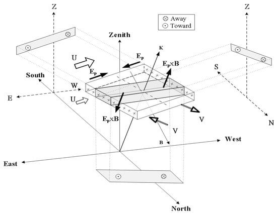 In Figure 4 and Figure 5, it is evident that, during the time interval when the propagations of the gravity wave were prevailing, the Doppler velocities of the FAI echoes were characterized as positive in the upper part of the Es layer and negative in the bottom side of the Es layer. The maximum vertical Doppler velocity shear can be as large as 68 m/s/km or more at times 20:57 LT and 21:02 LT. There is a tendency for the velocity shears to descend with the background Es layer, especially for the FAI echoes during the periods when the echo bulges were present. These features, combined with the horizontal distributions of the Doppler velocity shears that occurred quasi-periodically, strongly suggest that the prominent Doppler velocity shears bear close relation to the dynamic structures of the gravity wave. In order to explore the relations between the propagation of the gravity wave and the distribution of the Doppler velocity shear mentioned above, a schematic model is proposed below. Figure 10 is a schematic model of a background Es layer that is subjected to the effects of vertical wind shear of the zonal wind component U of a background tidal wind and the gravity-wave-induced meridional wind component V. The former is responsible for the formation of the thin Es layer, and the latter generates the polarized electric field Ep in the Es layer to drive the FAIs to drift in the direction perpendicular to the local magnetic field lines. The shaded parallelepiped is the radar-observed echoing region from the Es FAIs, which is the region where the radar wave vector K is nearly perpendicular to the local magnetic field lines B with an aspect angle usually less than 0.2°. The shaded parallelograms are, respectively, the projections of the echoing region on the vertical plane (with N-S and vertical axes), zonal pane (with E-W and vertical axes), and horizontal plane (with N-S and E-W axes). It is important to note that the radar-observed Doppler velocity of the Es FAIs is essentially the Ep × B drift velocity of the free electron in the Es layer. In the context of the Es layer shown in Figure 10, the west end of the radar-observed echoing region is expected to be higher than that at the east end due to the Ep × B drift effect that tends to lift up the west end and lower down the east end of the Es layer. As a result, a tilted Es layer is formed, and the positive Doppler velocity of the Es FAI echoes will be present in the upper portion of the tilted Es layer projected on the vertical plane, and the negative Doppler velocity will occur in the lower part of the projected echoing region. As for the FAI echoing regions projected on the zonal plane, it is obvious that the FAI echoes will be higher at the west end than those at the east end. Therefore, the schematic model proposed in Figure 10 can essentially account for the distributions of the radar-observed FAI echoes shown in Figure 4.