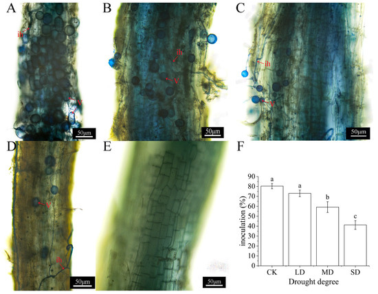 AMF inoculation in the root system of A. bifolium seedlings under drought stress. Note: (A–D) represent AMF colonization under normal moisture, light drought, moderate drought, and severe drought stresses inoculated with AMF, respectively; (E) represents the root colonization of A. bifolium without AMF inoculation; (F) represents the effect of different drought stresses on AMF infestation rate. “ih” represents intraradical hyphae. “V” represents vesicles. Different lowercase letters indicate significant differences in AMF infestation rates under different treatments at the 5% level according to the Duncan test.