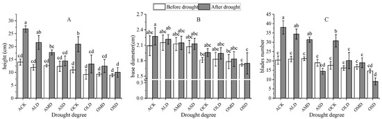 The original plant height, basal diameter, and number of blades were measured and recorded before drought stress (3 July 2022) using a meter ruler and vernier calipers. The diameter of the plant base was determined at a point 1 cm above the soil surface, and the plant height was measured from the plant base diameter to the highest point of the plant. Additionally, the data were recorded once more after drought stress using the same method. Five seedlings were selected as replicates for each group.