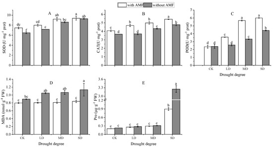 Effect of AMF inoculation on the antioxidant enzymes, MDA, and osmoregulatory substances of A. bifolium seedlings under drought stress. Note: (A) represents the SOD activity; (B) represents the CAT activity; (C) represents the POD activity; (D) represents the MDA content; (E) represents the Pro content. CK, LD, MD, and SD represent control, light drought, moderate drought, and severe drought, respectively; AMF represents AMF-inoculated plants, without AMF represents non-AMF-inoculated plants. Different lowercase letters indicate significant differences at the 5% level according to the Duncan test in the antioxidant enzymes of A. bifolium seedlings under different treatments.
