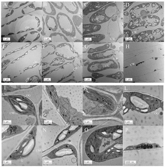 Effect of AMF inoculation on the chloroplast morphology of A. bifolium seedlings under drought stress. Note: (A–H) represents the changes in chloroplasts in ACK-OSD groups; (I–P) represents the ultrastructural changes in chloroplasts in ACK-OSD groups. CW represents cell wall, chl represents chloroplast, CM represents cell membrane, G represents grana, and OG represents osmiophilic granules.