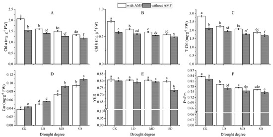 Effect of AMF inoculation on the photosynthetic pigment content and chlorophyll fluorescence parameters of A. bifolium seedlings under drought stress. Note: (A) represents chlorophyll a content (Chl. a); (B) represents chlorophyll b content (Chl. b); (C) represents total chlorophyll content (T-Chl.); (D) represents carotenoid content (Car); (E) represents actual photochemical quantum yield of PS II (Y(II)); (F) represents maximum photochemical quantum yield of PS II (Fv/Fm). Different lowercase letters indicate significant differences at the 5% level according to the Duncan test in Chl. a, Chl. b, T-Chl., Car, Y(II), and Fv/Fm of A. bifolium seedlings under different treatments.