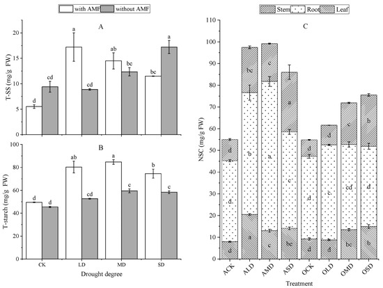 Effect of AMF inoculation on the SS, starch, and non-structural carbohydrates of A. bifolium seedlings under drought stress. Note: (A) represents total soluble sugar content (T-SS); (B) represents total starch content (T-starch); (C) represents non-structural carbohydrates (NSC). Different lowercase letters indicate significant differences in T-SS, T-starch, and NSC contents of A. bifolium seedlings under different treatments at the 5% level according to the Duncan test.