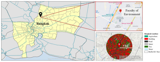Microclimate and air pollutant monitoring tower located at Kasetsart University (KU tower), Bangkok, Thailand, and land-use and land-cover types around the study area.