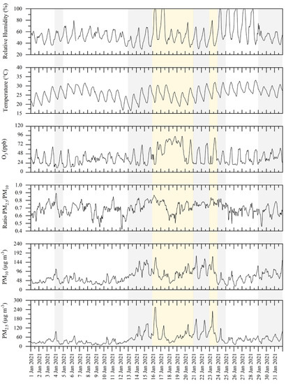 Time series of hourly (a) PM2.5 (µg m−3), (b) PM10 (µg m−3), (c) O3 (ppb) concentrations, and (d) PM2.5/PM10 ratios during 1–31 January 2021. Yellowish and greyish bands refer to the high pollution and high PM events, respectively.