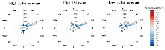 Wind rose diagrams during the high pollution, high PM, and low pollution events at 30 m agl at the KU tower.