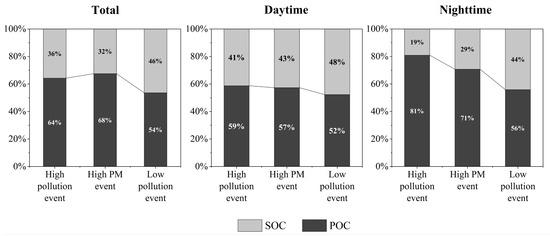 POC and SOC contributions to OC in the daytime and night-time during the high pollution, high PM, and low pollution events.