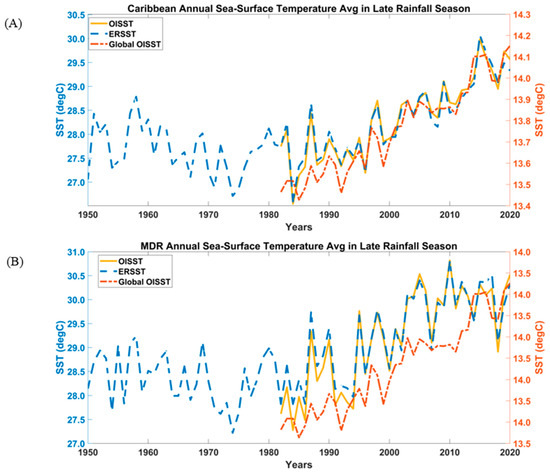 Sea surface temperatures (SSTs) in the mid-Atlantic and the Caribbean have steadily increased for several decades [1,2,3]. Mid-Atlantic SSTs are warming faster during the late rainfall season (LRS, August to November) than any other season (dry season, December to March, and early rainfall season, April to July), with temperatures reaching 26.5 °C and higher, which is the threshold considered for deep convection [4,5]. Upward trends in the Atlantic SSTs may intensify tropical cyclonic (TC) activity, posing more significant risks to coastal communities. Research shows that storms in the North Atlantic have increased in frequency and intensity since the 1980s [6]. Additionally, the Caribbean and the U.S. have experienced increasingly intense hurricanes recently; these are potentially linked to increasing SSTs [7]. More than 80% of Atlantic TC systems that turn into major hurricanes are formed within the main developing region (MDR, 10–20° N, 20–80° W), where TCs are primarily formed from easterly waves originating in Western Africa [8]. In their most recent work, Chand et al. [9] found that global tropical cyclones have decreased by 13%, except for North Atlantic storms. Thus, understanding the connection between a changing climate and the TCs frequency and intensification trends in this region is particularly important.