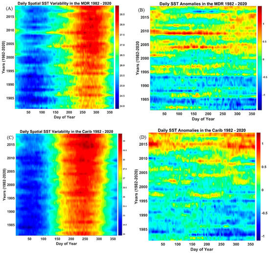 (A,C) Regional daily SST averages and (B,D) anomalies during the LRS for the MDR, the Caribbean, and the surrounding region. The x-axis represents Julian Days, and the y-axis represents 1982–2020. The color bar is SST in degrees Celsius. The daily anomalies were produced using the 39-year average (1982–2020) SST for each day of the year as the baseline.