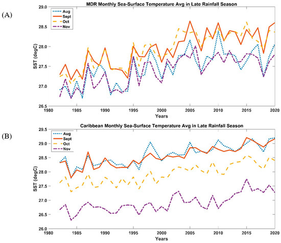 Further examination of the individual months during the LRS (Figure 4) shows that monthly average SSTs are cooler at the beginning of the season (August in the MDR) and are much warmer later (September to October in the MDR). October has notably warmer SSTs. Interestingly, October SSTs are about the same as or are warmer than September SSTs in the MDR. Though not the same for the Caribbean and surrounding region, overall, trends in monthly SSTs indicate that October stays warmer, and temperatures are increasing over time.