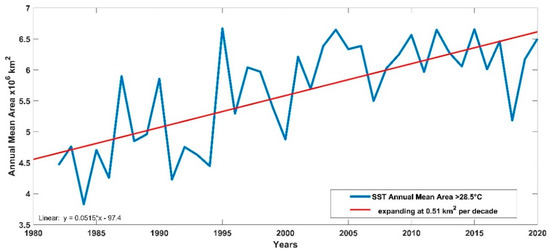 Illustrates the area index time series for the Atlantic Warm Pool (AWP), 1982–2020. The time series illustrates that the area of SSTs greater than 28.5 °C is expanding at a rate of 0.51 km2 per decade. The linear equation inside the plot shows the increasing trend.