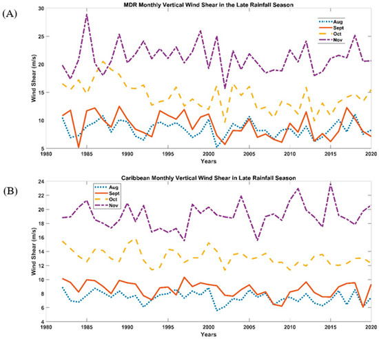 Monthly regional VWS trends from 1982 to 2020 using the NCEP/NCAR Reanalysis 1 product: (A) Wind shear during the LRS in the MDR; (B) Wind shear during the LRS in the Caribbean and the surrounding region.