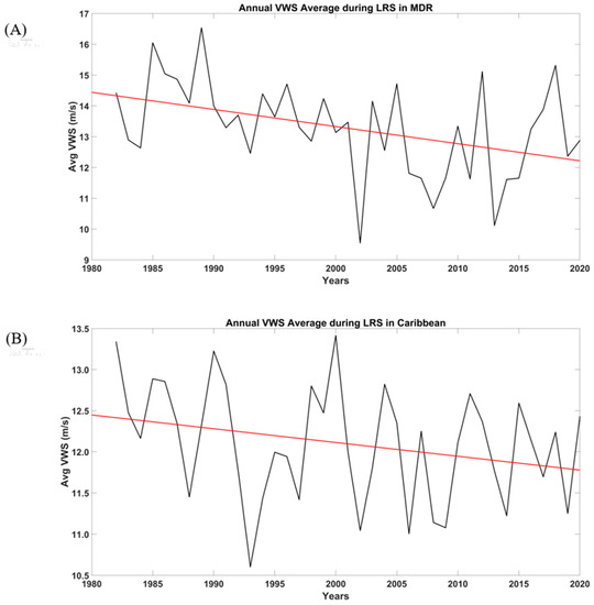 (A) Annual average of VWS during the LRS from 1982 to 2020 in the MDR, showing a decreasing trend at 0.56 ms−1 per decade; (B) annual average of VWS during the LRS from 1982 to 2020 in the Caribbean and the surrounding region, showing a decreasing trend at 0.16 ms−1 per decade.