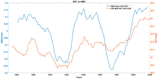 For this analysis, we took a longer SST record, using the NOAA ERSST dataset dating back to 1851, to correlate better with the AMO index dating back to 1861, as shown in Figure 8. The AMO index is calculated using the Kaplan SST dataset, computing the average SSTs north of the equator 0–70 N, detrended, and then smoothed with a 121-month smoother [22]. We averaged only the LRS and calculated a 10-year running average to better observe relationships, if any, to the AMO. Similarly, to Mann and Emanuel [10], our observation of the LRS SSTs in the MDR and the AMO indicated a relationship. However, other factors must also influence Atlantic SST changes. The correlation suggests that the AMO explains about 36% of the SST variance, and to describe the bulk of the variance requires a combination of factors linearly independent of the AMO. We conclude that the AMO is not the primary driver of warming Atlantic SSTs and may not be a significant cause of Atlantic TC changes.