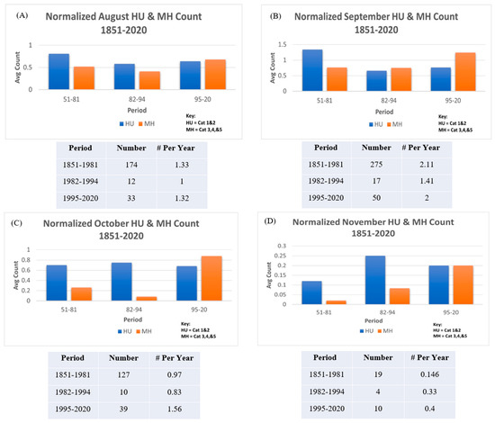 Categories 1 and 2 Atlantic hurricane (HU) and Categories 3 to 5 Atlantic major hurricane (MH) counts over the LRS months, (A) August, (B) September, (C) October, and (D) November, 1851–2020. The blue bars (HU) indicate low-intensity storm counts, and the orange bars (MH) indicate high-intensity storm counts. The tables below each month show the overall storm counts vs. average storm occurrence per year for that period.
