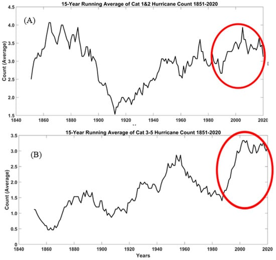 (A) Low-intensity, HU (Category 1 and 2) and high-intensity, (B) MH (major hurricanes) (Category 3 to 5) Atlantic average storm counts from 1851–2020. Storm counts are taken from the HURDAT2 database. Plots indicate increasing storm counts in the recent 39 years, as highlighted by red circular markers.