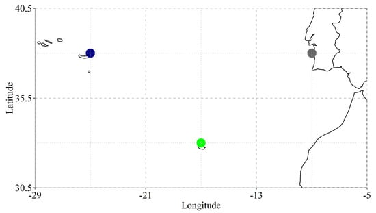 Colored circles show the approximate location of GNSS receivers at Continental Portugal (Lisbon and Cascais, grey) and the Azores (Furnas, blue) and Madeira (Funchal, green) archipelagos. The colors of the circles correspond to the colors of the lines in Figure 5.