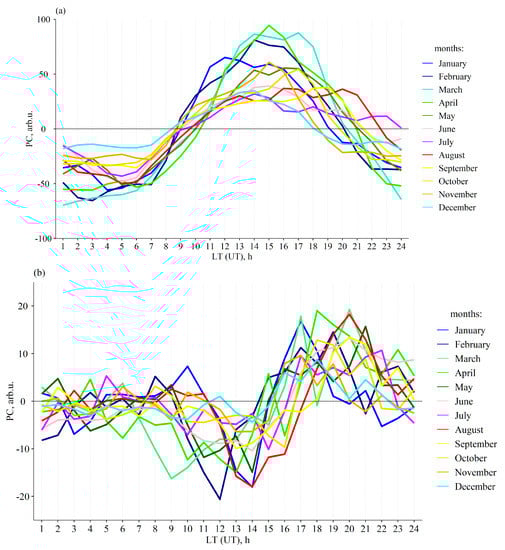 Examples of TEC PCs: PC1s (a) and PC2s (b) calculated for months from January to December of 2015.