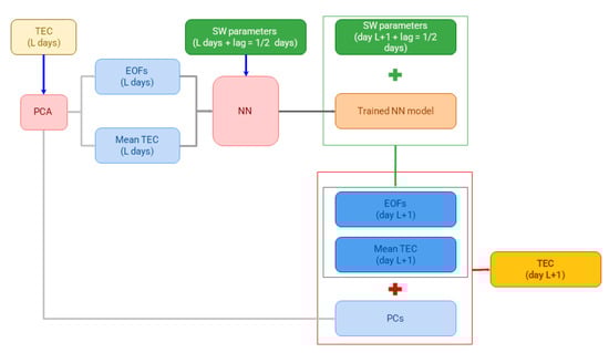 - NN models are built to forecast the daily mean TEC and the amplitudes of the first two PCA modes using the lagged SWp. These NN models are used to forecast the daily mean TEC and the amplitudes of the first two PCA modes, and as a result the 1 h TEC series, for the following day.