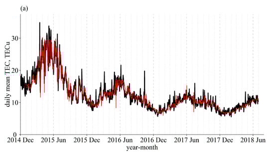 Neural networks (NN), see, e.g., [,,], and NN in combination with different decomposition methods such as ensemble empirical mode decomposition (EEMD) [] and principal component analysis (PCA), see [], and references therein for a review of PCA-NN-based TEC models, as well as, e.g., [,] of TEC data are often used to forecast TEC. Most of them use a set of space weather parameters (most often used are the solar F10.7 index and the geomagnetic indices Kp and Dst) as predictors for TEC variations. In general (see [] and references therein), such models allow for forecasting TEC with RMSE or MAE (root mean squared error and mean absolute error, respectively) in a range from ~2 to 15 TECu depending on the season, geomagnetic and solar activity levels during the studied time interval, geographic location, and type of TEC data (single-station data or global ionospheric maps).