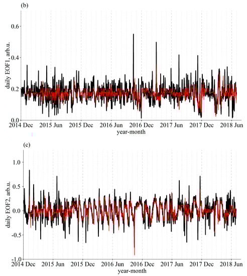 The observed (black) and forecasted (red) series of the daily mean TEC (a), EOF1 (b) and EOF2 (c).