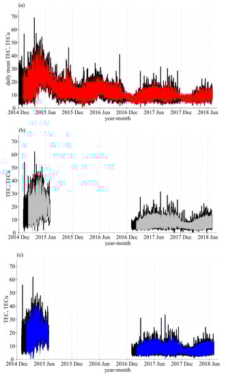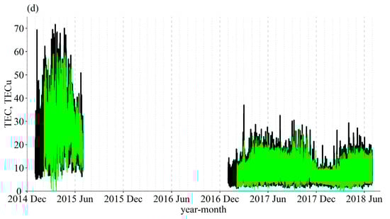 The data, originally of 1 min time resolution, were averaged to obtain the 1 h series. The raw TEC data were processed using a “SCINDA-Iono” toolbox for MATLAB and scripts for R [,] developed by our group. The data between December 2014 and February 2019 are available at [,]. The first part of this dataset, which includes only the data for 2015, is described in [], and TEC variations related to the solar flares and geomagnetic disturbances of 2015 were analysed in []. An extension of the TEC series (data for December 2014 and from January 2016 to February 2019) is described in [].