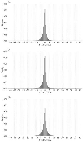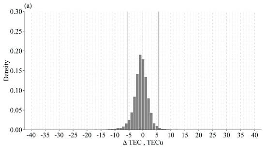 As one can see, the PCA-MRM model performs well when compared to other models [] during days without significant geomagnetic disturbances, even if a flare is observed. The daily mean and monthly mean MAE depend on the mean values of the geomagnetic indices Dst, Kp, and ap: the PCA-MRM model both under- and overestimates TEC values during days with geomagnetic disturbances with approximately similar rates; however, large overestimations are seen more often than large underestimations.