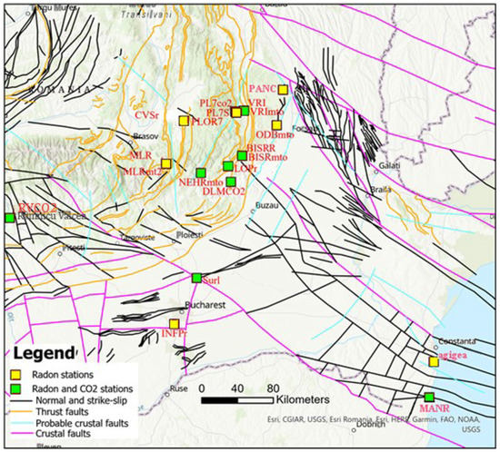 The Carpathian Mountains formed through a process spanning the Triassic to Tertiary periods, involving the transformation of continental units and the closure of Alpine Thetys and its branches. These continental units consist of the Tisza–Dacia and Alps–Carpathian–Pannonian (ALCAPA) blocks, located internally, while externally, there is the European/Scythian/Moesian continental foreland. The arcuate shape of the Carpathians is mirrored by this external foreland [19]. During the Quaternary period, the significant amount of shortening, reaching up to 5 km, was laterally distributed through transcurrent movements along the major faults that delineate the southeastern Carpathians, specifically the Trotus and Intramoesian faults. Notably, there are observable patterns (south to Trotus Fault) of active faulting in close proximity to the boundary between the Moesian platform and the North Dobrogean orogen. These patterns can be attributed to strain partitioning, which occurs due to the differentiation of stress between mechanically weak and strong lithospheric regions, as explained by Matenco et al. in 2007 [20]. As a result of this complex tectonic evolution, the Vrancea zone is characterized by seismic activity from both crustal and intermediate earthquakes, with moderately strong to strong earthquakes occurring more frequently in the intermediate sector. Intermediate seismicity is concentrated in the bend of the Carpathian arc in the Vrancea region. In the intermediate sector, a compressive regime dominates, leading to reverse faulting and vertical extension [21]. Conversely, crustal earthquakes are influenced by an extensional regime characterized by normal and strike-slip faulting [22]. As it can be seen in Figure 2, we plotted on the map the main faults resulting from the complex tectonic process described above, as well as the distribution of measurement stations. The radon measurement stations are located both near the faults and above the two seismic zones in Vrancea (Intermediate Vrancea and Crustal Vrancea).