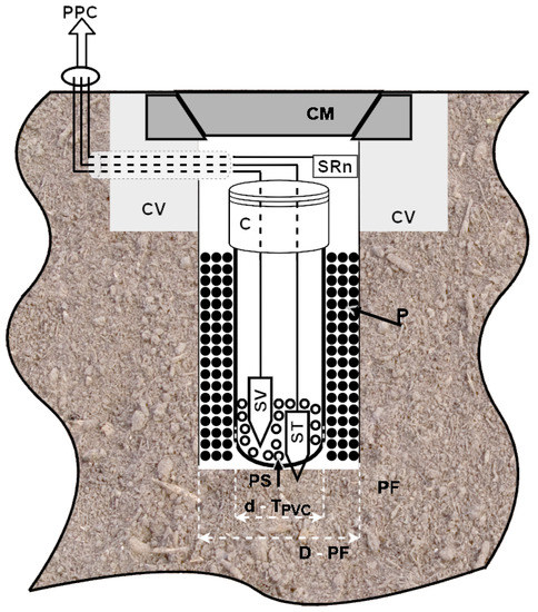 More explanations can be found in [28]: ‘According to Figure 3, the vibration transducer SV is mounted between glass beads PS in a drilled well PF 40 m deep and D-PF diameter Φ 350 mm. For the SV protection and of the ST temperature sensor, they are mounted in a PVC protection tube with a diameter of d- TPVC Φ 120 mm. The space between the TPVC and the diameter of the drilled well D-PF is filled with gravel P (1–3 cm), which ensures the diffusion of radon to the radon detector SRn mounted in the manhole CV made of reinforced concrete and covered with a metal cover CM. The PVC TPVC protection tube is covered with a C cover also made of PVC’.