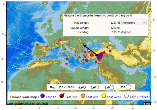 Superposition of the earthquake swarm in Romania with the seismic events in Turkey (6 February 2023, 7.8 R and 7.5 R), picture EMSC/CSEM, http://www.emsc-csem.org/, accessed on 6 February 2023.