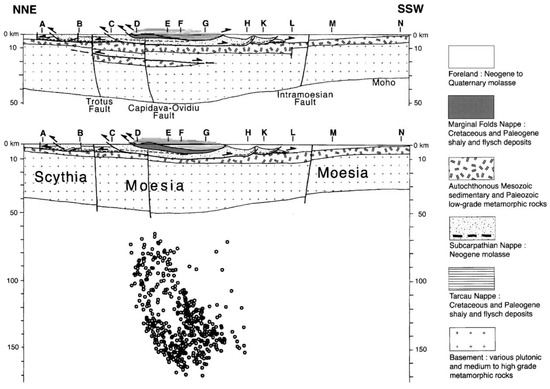 Pre-1999 geological section along the main NNE–SSW VRANCEA99 [40].