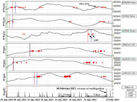 The closest radon and CO2 monitoring stations are in Dalma (DLMdd), Bisoca (BISRAERd), and Lopatari (LOPRdd) (Table 1). Applying the mentioned methods, we obtained the evolution of radon and CO2 as in Figure 7. Only for LOPRdd did we use the 2SD detection method [33], while for the others, we used STA/LTA. It was observed that radon and CO2 had similar variations, and those in Bisoca and Dalma were similar, unlike those in Lopatari. Moreover, the detections (marked with red dots) can be associated with groups of earthquakes, and the seismic pause that preceded the sequence of earthquakes was longer (seismic quiescence of 7 days [17]). In conclusion, the first seismic event in Turkey could only have triggered what is happening anyway, with the Râmnicu Sărat area being known for such behavior.