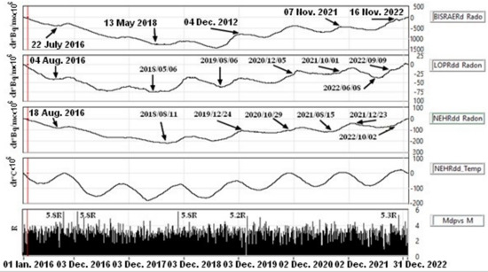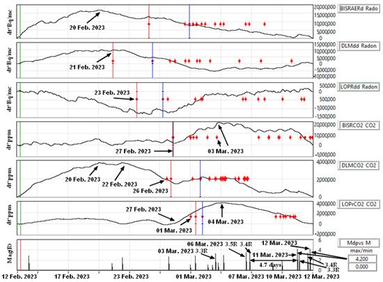 The 4.2 R earthquakes were located in the Gura Teghii seismic zone, and all epicenters were on faults (Figure 5). The detections starting with 20 February 2023 in Figure 8 (red points) were of the STA/LTA type and were applied to the integrated time series. There was a similarity in time variations between radon in BISRAERd, DLMdd, and carbon dioxide in DLMCO2 (maximum during 20 February 2023 followed by a decrease). Moreover, the evolution of radon in LOPRdd was similar to CO2 in BISRCO2 and LOPrCO2.