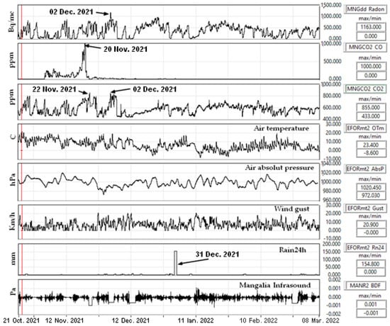 The next analyzed case refers more to environmental pollution than to a relationship between gas emission and seismicity. In Table 5, the last two stations (named Agigea, Agigea locality, and MNGdd, Mangalia locality) refer to the results of radon monitoring at the Black Sea (their positioning is in Table 1). A large difference was observed in the level of radon caused by MNGdd, while in Agigea, the radon values were normal (Table 5). However, the time periods in which the determinations were made should be noted. Those in Mangalia were recent and may have been affected by the development of the city and the port. Not only the high values attracted our attention, but also the way in which the gas emission varied in this location. In Figure 9, there are very large variations of radon that did not repeat at intervals of one day and did not depend on temperature, atmospheric pressure, precipitation, or wind (EFORmt2 is a meteorological station, Table 2). Besides these, the presence of CO and the way it varied indicated a pollution that can be caused by the activity of the port, a hospital, or the nearby water treatment plant. The radon measurements at the Black Sea were described in [41], wherein the emission of gases (radon, CO2, methane, hydrogen sulfide) was specified and analyzed, but not in the coastal region of Romania.
