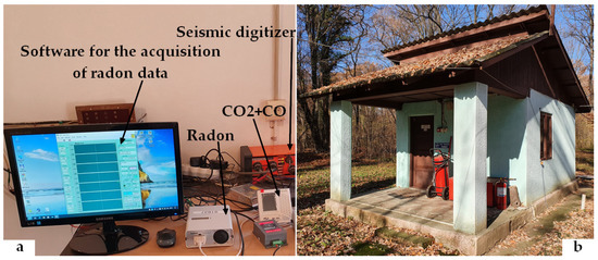 Surlari monitoring station: (a) radon, CO2, and CO equipment; (b) the location is in a forest.