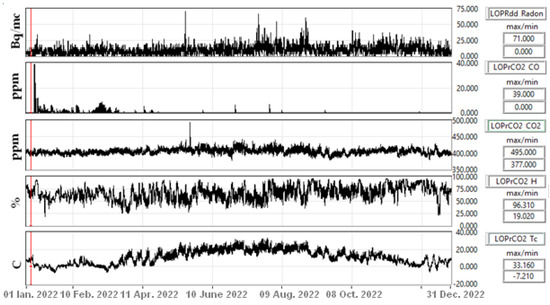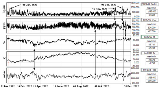Another issue is the influence of meteorological parameters on gas emissions, which is presented in many articles [42,45,46]. For our case study, we chose the same time period (year 2022) as in Figure 11 to follow the evolution of radon and CO2 as a function of temperature, humidity, and atmospheric pressure. Table 8 shows the correlation between radon and CO2, humidity, temperature, and atmospheric pressure (the complementary parameters measured by the same instruments) for the year 2022.