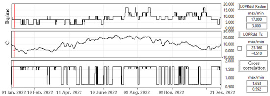It was observed that there was a relationship between the radon level and temperatures in the sense that during the winter, the radon emission increased. The Surlari location is close to the Intramoesica fault and is characterized by surface seismicity. It was observed that there was a relationship between the radon level, temperature, humidity, and atmospheric pressure [42,43,44]. Seasonal variation indicated an increase in radon emission in winter (lower temperatures), while CO2 increased in summer (higher temperatures). The daily variations of radon indicated a maximum around 10 UTC hour and a minimum approximately at 19 UTC hour. After filtering with a median filter (LabVIEW library) on the time series from Figure 11 for reducing the daily variations and spikes, we applied a cross-correlation function (LabVIEW library) and obtained the average values from Table 8 (example in Figure 12 and Figure 13). Regardless of the chosen method, it is important that it is used under the same conditions in all the analyzed cases. So, Table 8 is relative to this method over the entire time period (one year) and allows for comparative data analysis. The possible high values of radon and CO2 levels were the relation between gas emission and vegetation [34]. The operation of the equipment was checked under normal conditions, and the results were satisfactory. The sensors in Figure 10 were moved because the room where the measurements were taken was not the best location for determining the source of radon or CO2.