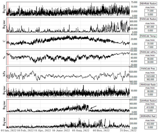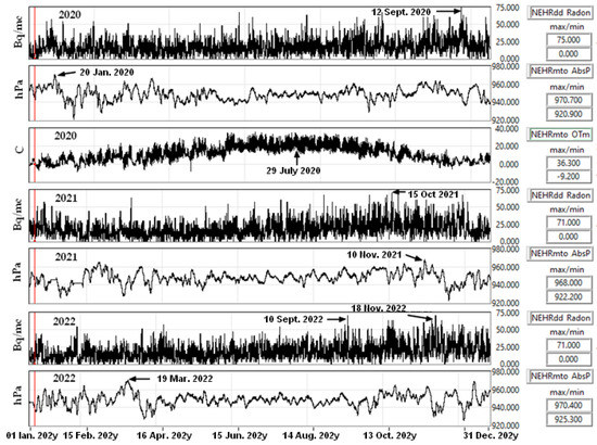 Laboratory measurements of radon highlighted the same direct positive relationship between radon emission and temperature [10]. This is valid if the radon emission and its measurement are done in the same place. In our locations, the rooms where the equipment are placed are not hermetically sealed, and radon can come from nearby areas as a result of air currents. From Figure 11, Figure 13 and Figure 14, a similar evolution of radon can be observed in LOPRdd, RMGVdd, SAHRdd, and BISRAERd (higher values in summer) and for SURLdd, NEHRdd, and PANCdd (higher values in winter). These results are preserved if we analyze the evolution of radon over several years (Figure 15).