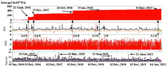 The next case analyzed concerns the relationship between radon emission and seismicity. We already analyzed the Râmnicu Sărat case (Table 6, Figure 7) and the 11 March 2023–12 March 2023 earthquake series (Table 7, Figure 8). We next chose a longer period between 2016 and 2022 and earthquakes larger than 4.5 R in the Vrancea area (Table 10). The preparation zone PZone was determined by the relationship of Dobrovolsky [47] as a function of magnitude. The relation was experimentally verified with Mw. The monitoring station should be located in this area to assess a relationship between radon and earthquakes. Different formulas for the relationship between earthquake magnitude and preparation distance by different authors were mentioned by Nevinsky in [41]. In general, this condition is satisfied in Table 10, since we chose a threshold value of 4.5 R for the magnitude. The relationship between the accumulated seismic energy, the parameters a-b from the Gutenberg–Richter law [15,16], the seismicity, and the number of earthquakes generated in a 7-day interval is shown in Figure 16.