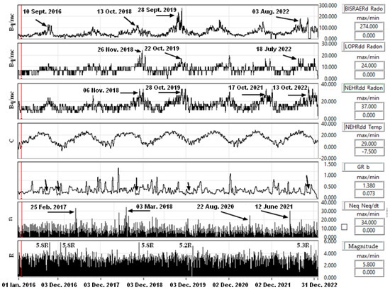 In presenting the link between the radon level and seismicity, we used the parameters a–b from the Gutenberg–Richter law (Figure 16). We observed that a decrease over a period longer than 18 days of the parameter ‘b’ from the Gutenberg–Richter law (GR_b) is followed by earthquakes with a magnitude greater than 5 R (Figure 16 and Figure 17) for the Vrancea area. For this reason, there is no general method, and an implementation of an OEF must take into account the particularities of the monitoring area. In our case, the Vrancea area is unique in Europe due to its geological structure and its deep earthquakes.