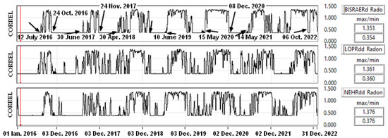 Correlation factor between ‘b’ parameter and radon in BISRAERd, LOPRdd, and NEHERdd, 2016–2022; time windows of 7 days.