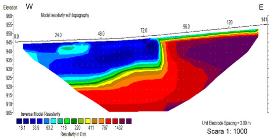 Electrical resistivity tomography section in Bisoca station BISRAERd (project of the Romanian National Authority for Scientific Research, Programe STAR, project 84/2013, made by Getotec Consulting SRL).