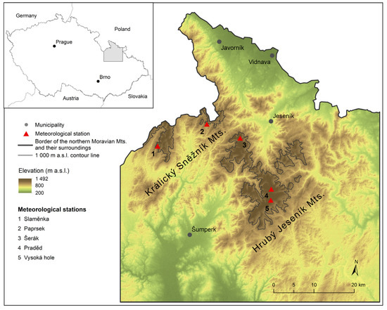 The area studied is situated on the borderland of northern Moravia and Czech Silesia (the Hrubý Jeseník Mts.) and eastern Bohemia (the Králický Sněžník Mts.) in the CR (Figure 1). The Hrubý Jeseník Mts., the second-highest mountain range in the CR, extends around 523 km2 with the highest point, Praděd (1492 m a.s.l.) and a mean elevation of 887 m. In total, 56 main peaks in the Hrubý Jeseník Mts. exceed the elevation of 1000 m [32]. The three main ridges divided by deep valleys are oriented in the northeastern–southwestern and northwestern–southeastern directions [33].