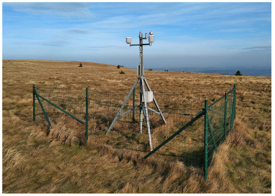 The Vysoká hole station (1464 m a.s.l.) was the only one built by Masaryk University (Brno, Czech Republic) and put into operation on the 7th of October 2017 (see Figure 2). The station was situated at the top of the mountain Vysoká hole (the Hrubý Jeseník Mts.) above the timberline surrounded by alpine grassland and a small dwarf pine plantation. This plantation has now disappeared, and the station is surrounded only by alpine grassland. One of the purposes of the station was to obtain relevant microclimate data representing the alpine grassland area within the ECOPOLARIS research project. The station measures mean, maximum and minimum temperatures (°C) at 2 m’ height in 10-min intervals using an EMS33R sensor (EMS Brno, Czech Republic) with an accuracy of ±0.15 °C. The temperature sensor was placed in a naturally ventilated radiation shield and calibrated regularly every year. The station fulfills the same technical demands as the stations within the CHMI network. Moreover, according to the World Meteorological Organization’s (WMO) Guide to Meteorological Instruments and Methods of Observation [43], the station meets most WMO requirements. Therefore, the station appropriately complements the relatively sparse meteorological station network above 1000 m a.s.l. both in the northern Moravian region and the Czech mountains generally.