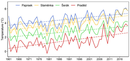 However, air temperature measurements at synoptic and climatological meteorological stations at the Hrubý Jeseník Mts. in the second half of the 20th century were characterized by their inconsistency and spatiotemporal variability [38]. In the Králický Sněžník Mts. (Figure 1), the oldest meteorological measurements situated above 1000 m a.s.l. come only from 2010 (Paprsek station, 1006 m a.s.l.).