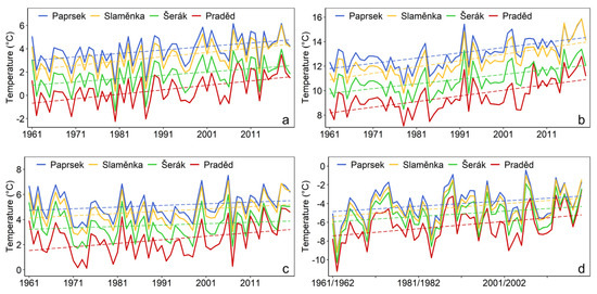 Seasonal temperature variability and linear trends (dashed) at the selected meteorological stations Paprsek, Praděd, Slaměnka and Šerák in (a) MAM, (b) JJA, (c) SON and (d) DJF in the 1961–2020 period (A timeline in DJF corresponds to the individual winter seasons).