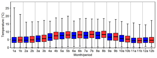 In order to compare the variability of daily temperature amplitudes between individual months and the 1961–1990 and 1991–2020 periods, daily amplitudes based on means for each day of the year for the whole 1961–2020 period smoothed by a 21-day window for each station were calculated and visualized using box plots, which include data for the four stations altogether (Figure 5). Every month is represented by boxplots for both 30-year periods (e.g., January of 1961–1990 and January of 1991–2020), enabling their direct comparison in the context of annual variations of included variables. Higher median temperature amplitudes were recorded in the 1991–2020 period, particularly in the summer half-year, but there is no clear pattern in amplitude variability changes.