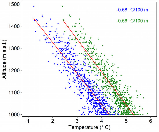 Substantial changes arose in the case of the mean annual temperature gradient per 100 m (at the level of 1000–1492 m a.s.l.) between both normal periods (Figure 6), derived from the interpolated grid layers. During the 1961–1990 period, the mean temperature gradient was −0.58 °C/100 m and decreased to −0.56 °C/100 m in the more recent period. Nevertheless, temperature differences between the same altitudes were statistically significant, and higher differences were recorded mostly at higher elevations. For instance, the largest positive difference was recorded at an elevation of 1325 m a.s.l. (1.23 °C) and the lowest at 1000 m a.s.l. (0.83 °C). Dividing the study area into five levels (1000–1099, 1100–1199 m a.s.l., etc.) confirms the highest statistically significant differences of positive temperature in the highest elevations, i.e., in the levels of 1400–1492 and 1300–1399 m a.s.l. (1.1 °C). The lowest warming between both periods was recorded in 1000–1099 m a.s.l. level (1.00 °C).