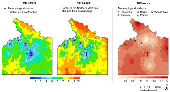 Spatial variability of mean annual temperature (°C) in the northern Moravian Mts. region between the 1961–1990 and 1991–2020 periods and its difference.